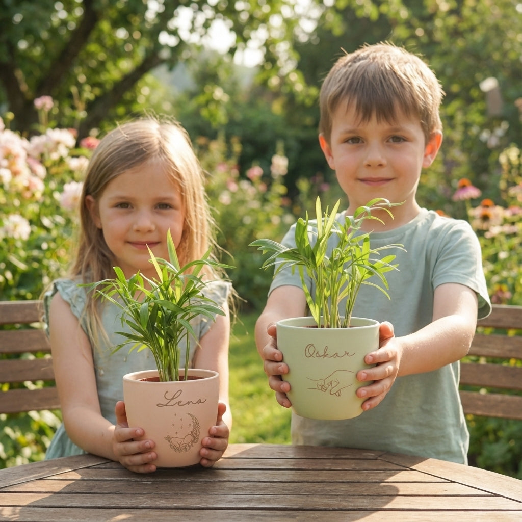 Lass den Topf mit deinem Wunschnamen gravieren und wähle aus 27 süßen Motiven – von Mond & Sternen bis zu zarten Baby-Illustrationen. Jeder Topf wird individuell lasergraviert und ist damit ein echtes Unikat.